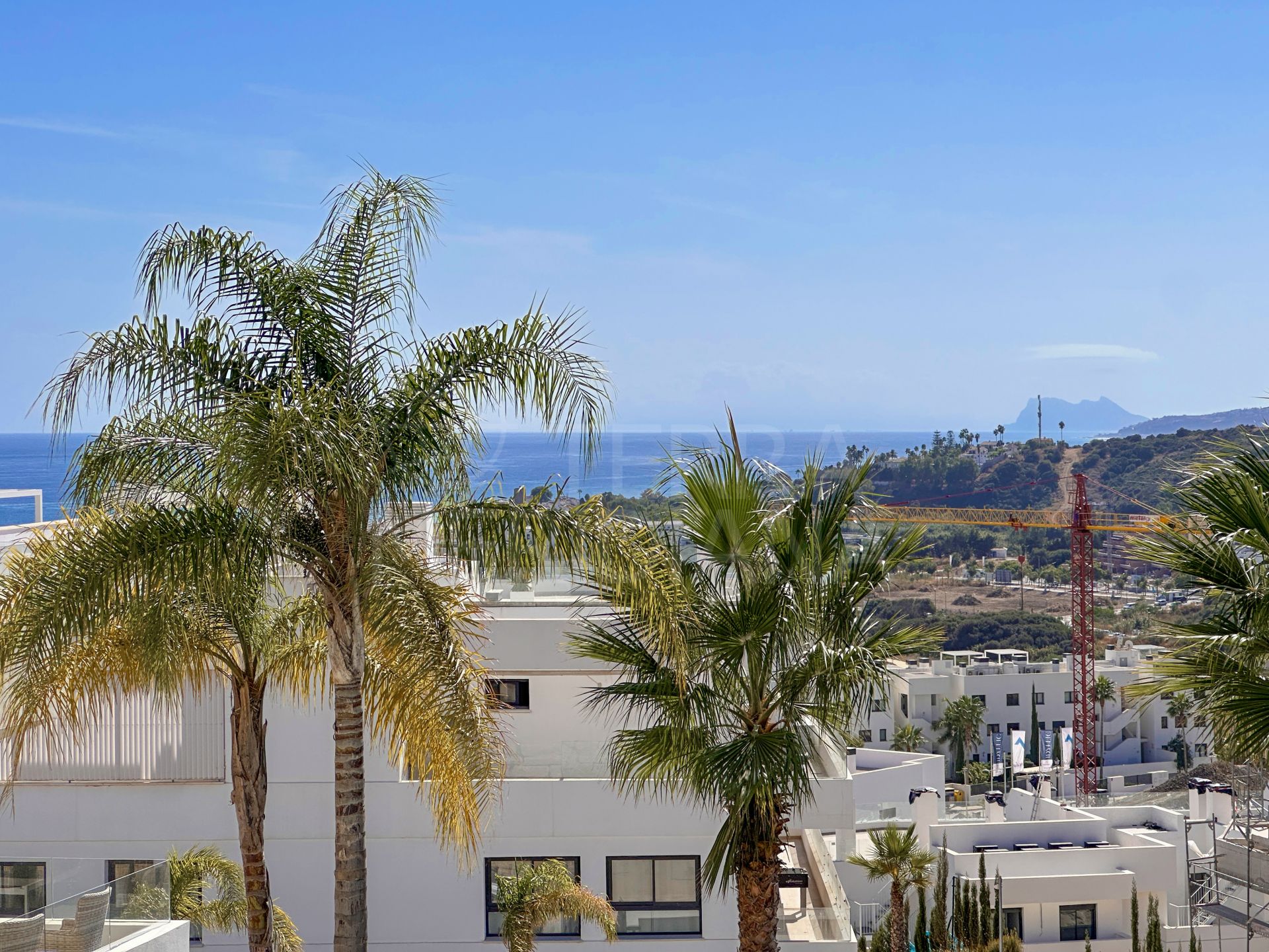 Situated on an elevated first floor, the property offers 99 m² of interior living space with a bright south-facing orientation. It includes a large underground parking space and a spacious storage room. Access is provided by lift, opening into a stylish open-plan kitchen, living and dining area. From the moment you enter, your attention is drawn to the breathtaking sea views. The living space flows seamlessly onto a generous 52 m² terrace, the perfect place to relax and enjoy panoramic vistas of the communal pool, the Mediterranean Sea, Gibraltar, and even the coast of Africa on clear days.