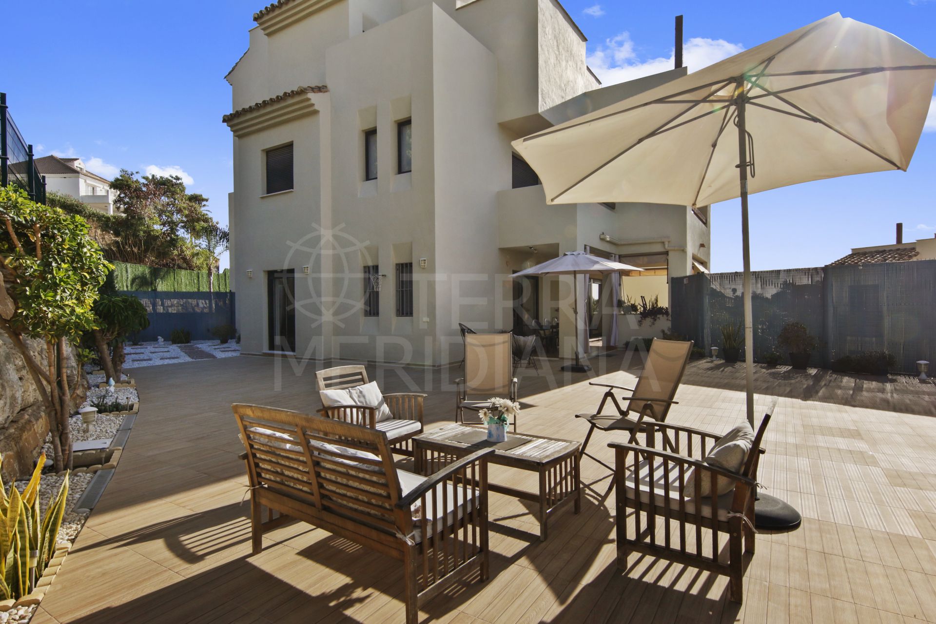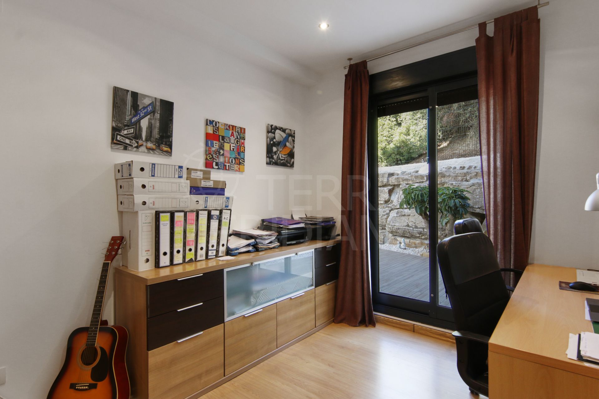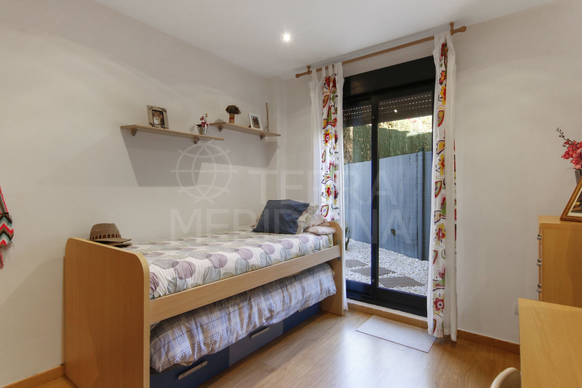A hallway leads to the sleeping quarters, where you’ll find a complete bathroom that serves the two guest bedrooms and also functions as a guest toilet. The first bedroom offers direct access to the back garden, while the second bedroom, currently used as an office, also opens onto the garden. The master bedroom suite includes its own private en-suite bathroom and direct access to the terrace.