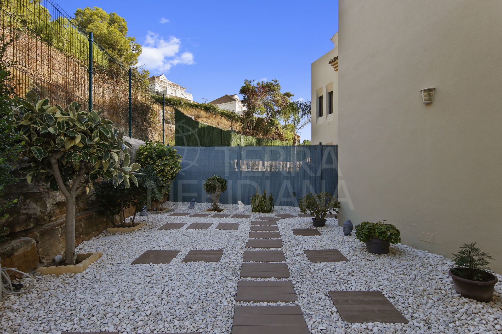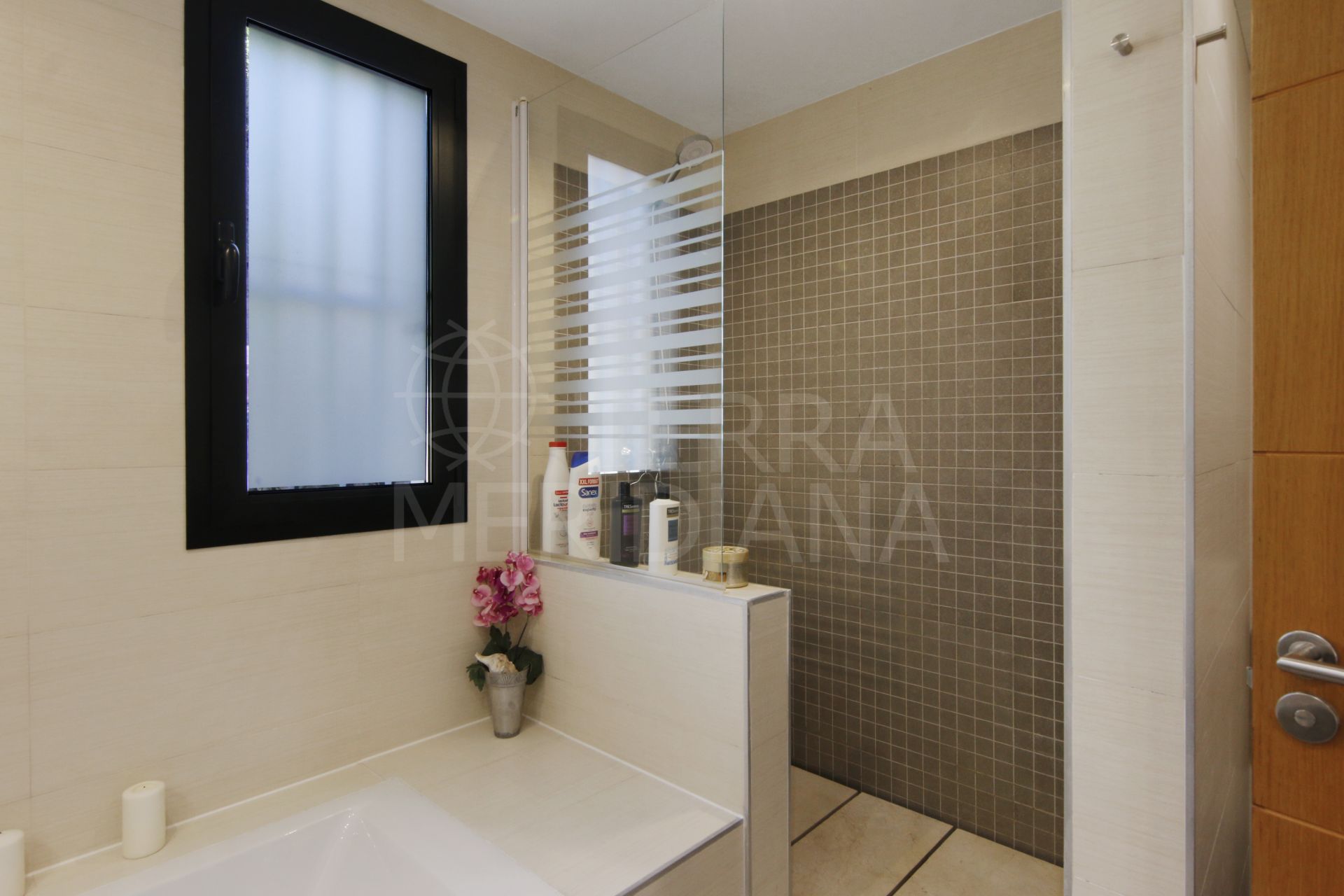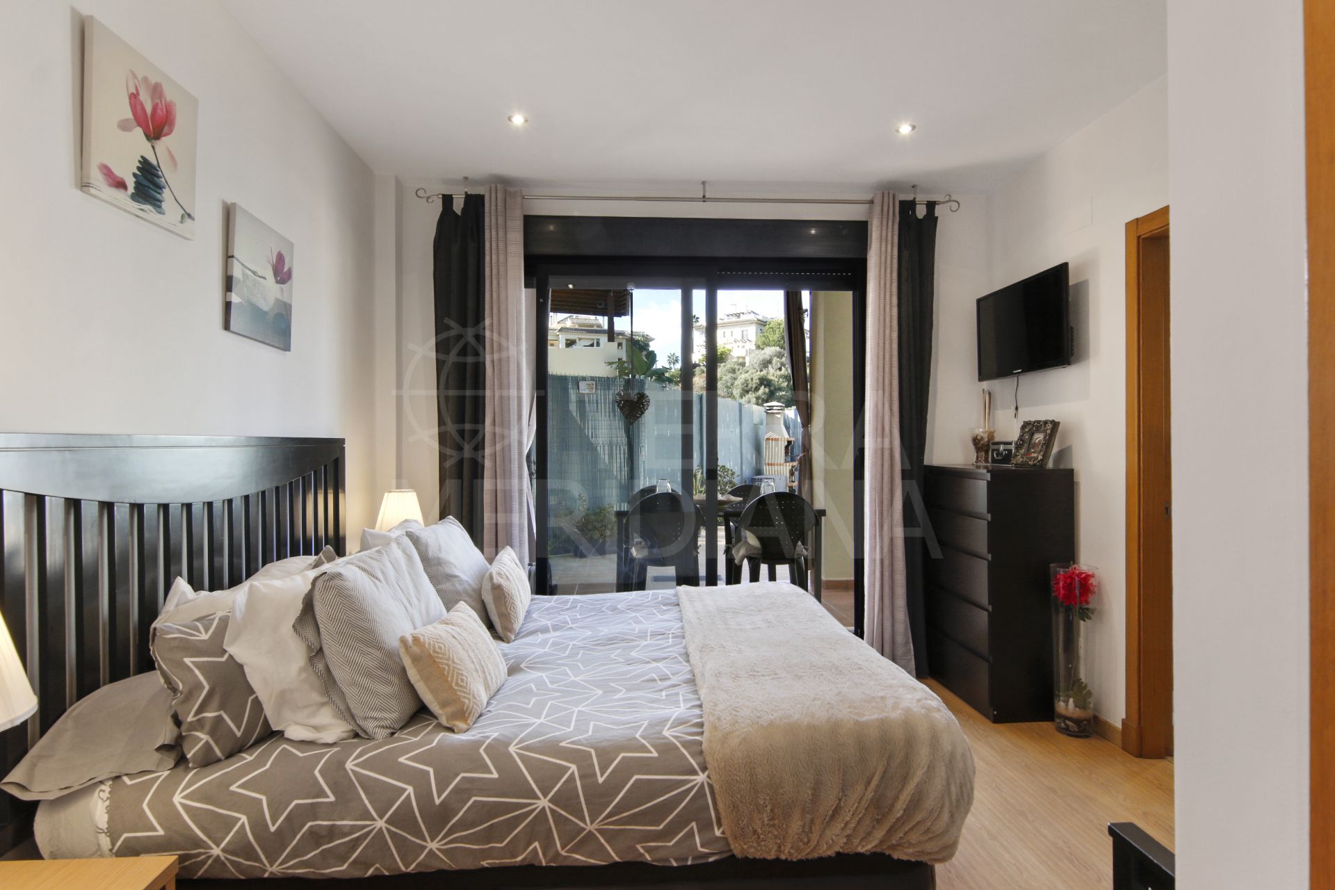 A hallway leads to the sleeping quarters, where you’ll find a complete bathroom that serves the two guest bedrooms and also functions as a guest toilet. The first bedroom offers direct access to the back garden, while the second bedroom, currently used as an office, also opens onto the garden. The master bedroom suite includes its own private en-suite bathroom and direct access to the terrace.