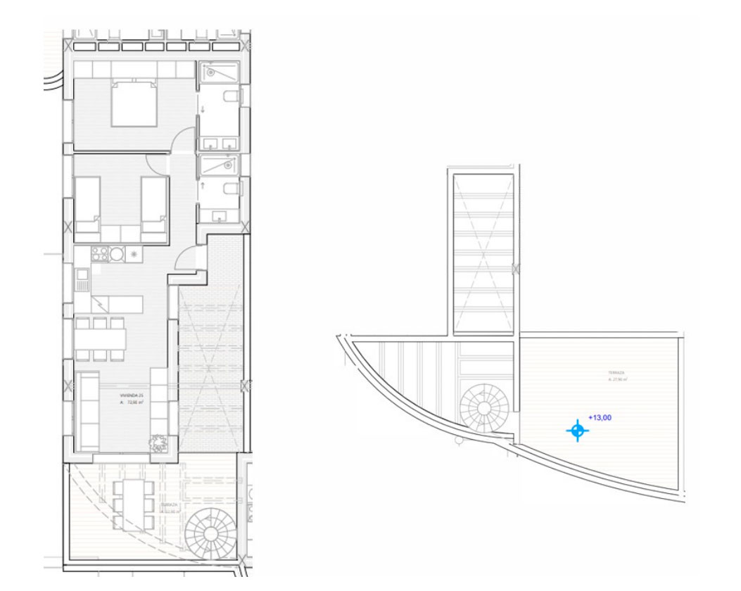 Inside, the penthouse showcases an open-plan layout that seamlessly connects the kitchen, dining, and living areas into one bright, inviting space. Floor-to-ceiling glass doors open onto a generous main terrace, leading up to the expansive rooftop solarium via an exterior staircase. From here, you can enjoy panoramic sea and mountain views, unwind by your private pool, and take in the Mediterranean sunshine.