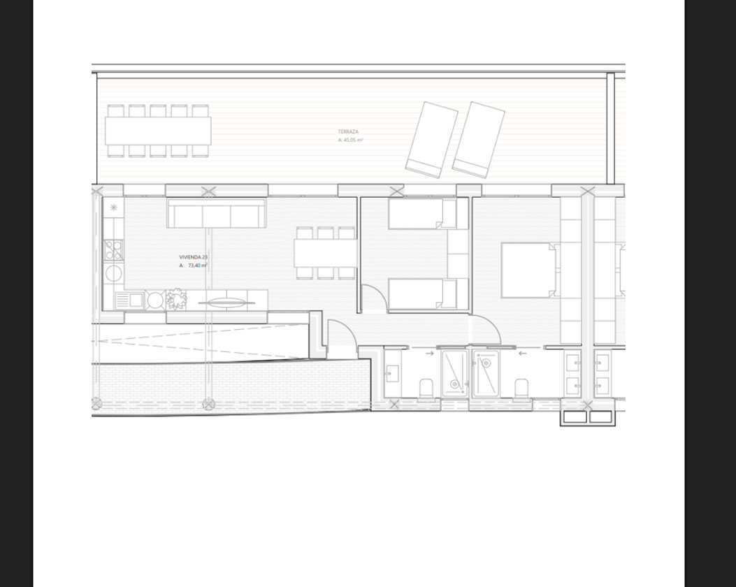 Inside, the apartment features an airy open-plan layout that combines the kitchen, dining, and living areas into a bright and inviting space. Floor-to-ceiling glass doors lead out to the main terrace, ideal for relaxing or entertaining. The property comprises two bedrooms, including a master suite, while the guest bedroom has convenient access to a full bathroom located in the hallway.