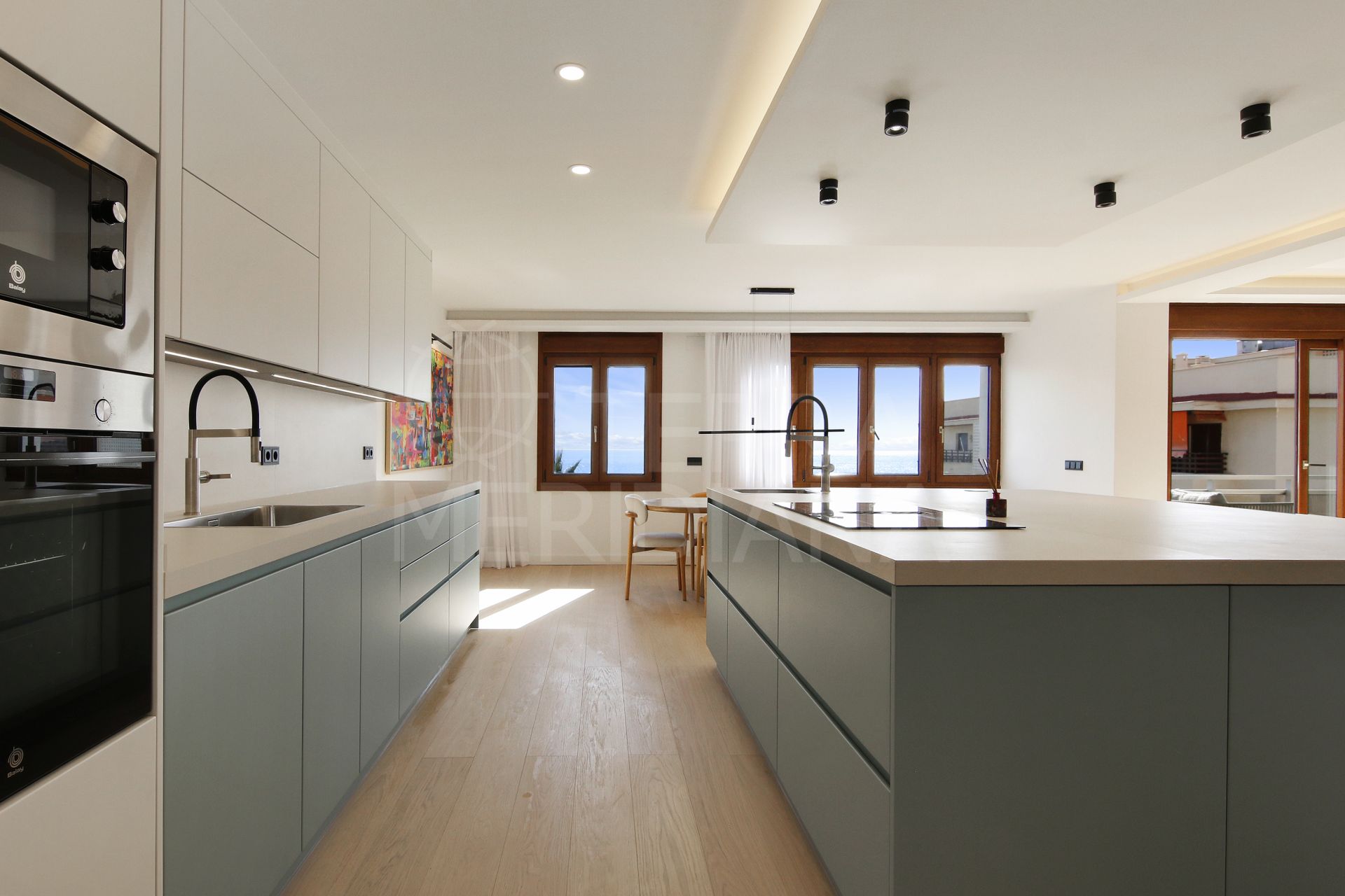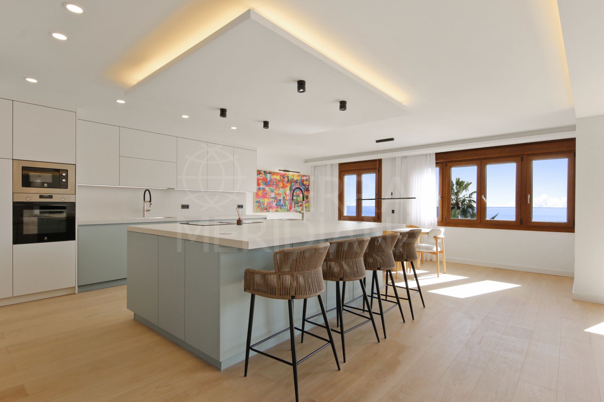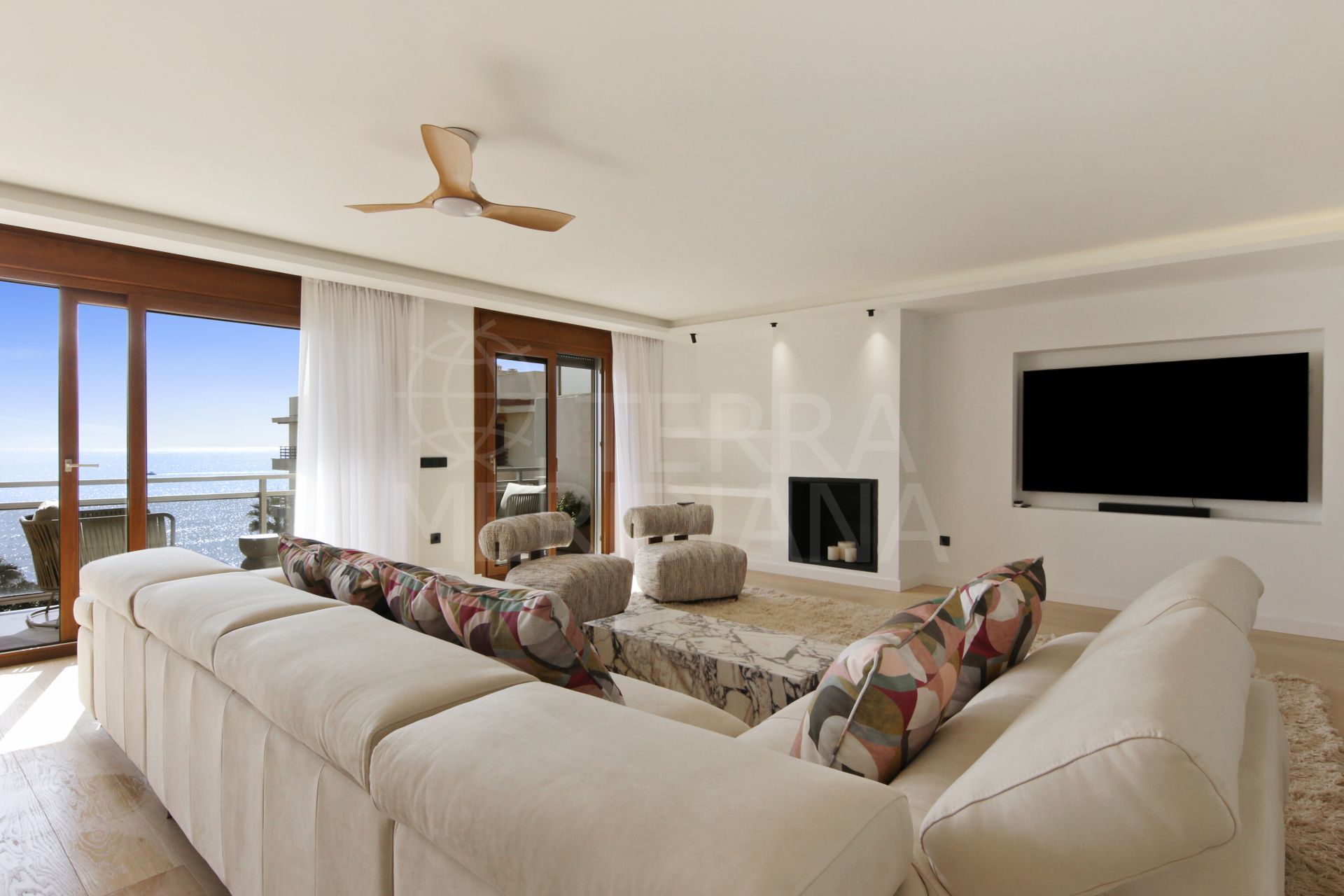 Commanding an unparalleled position directly on Estepona’s beachfront, this remarkable fifth-floor penthouse epitomizes coastal luxury and refined contemporary living. Recently reimagined through a complete, top-to-bottom renovation, the residence combines two apartments into one expansive sanctuary — offering a rare sense of space, sophistication, and seamless modern comfort.