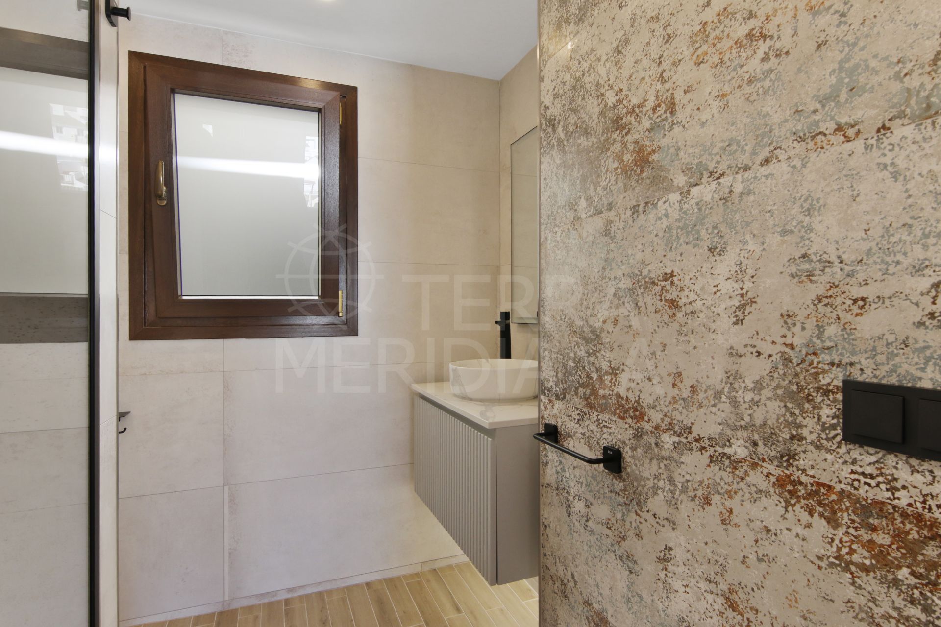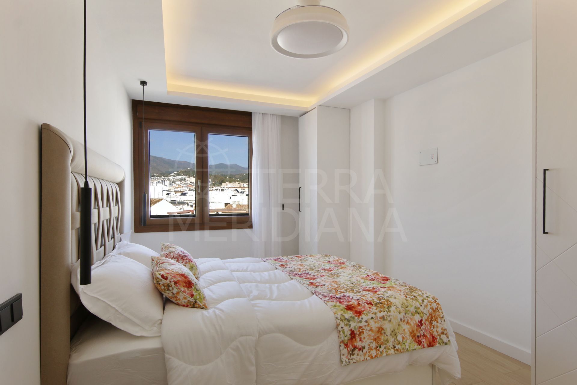 A hallway leads to three well designed bedroom suites, each with beautifully appointed en-suite bathrooms and picturesque views stretching across Estepona’s charming old town to the Sierra Bermeja mountains. The master suite enjoys its own private terrace — a peaceful retreat overlooking the historic heart of the city.