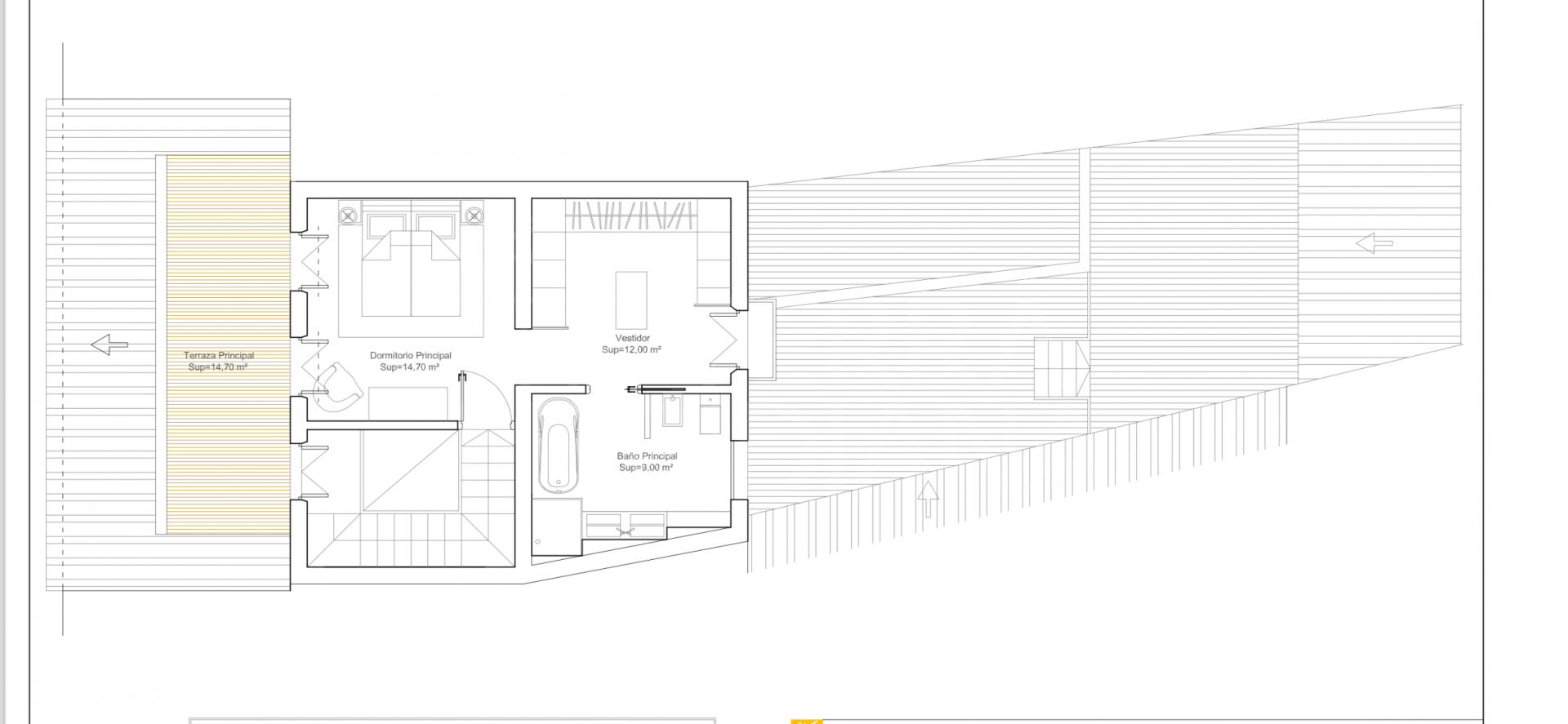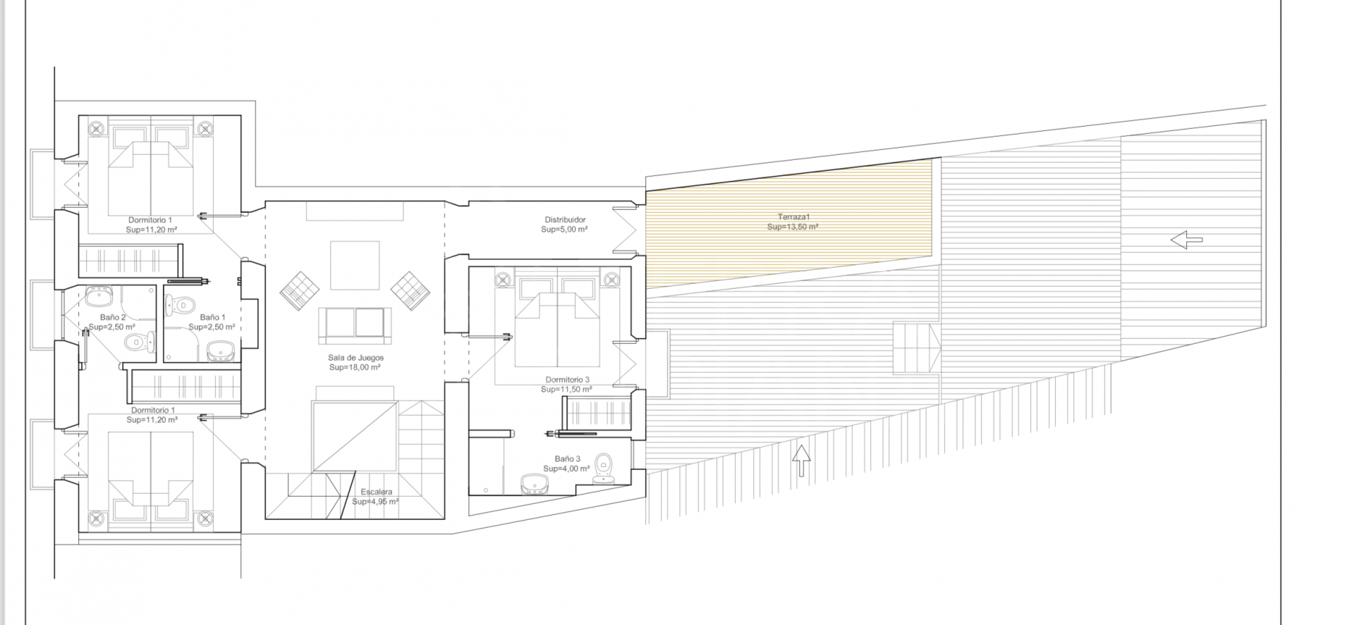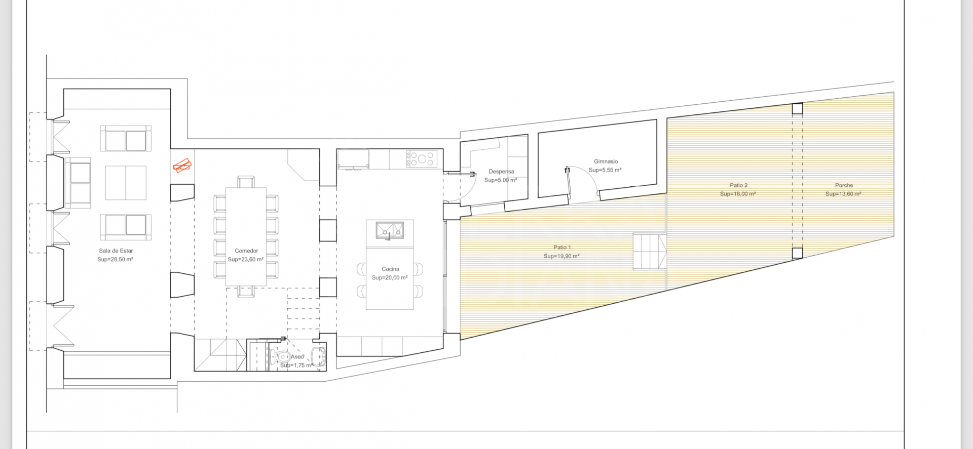 The proposed project includes a spacious open plan living room, 4 double bedrooms, 5 bathrooms, 2 living rooms, a large dining room, large kitchen opening into the garden area and patio. In detail: Ground Floor comprises a large open plan living room as you enter the property, followed by a dining room and a spacious kitchen with adjacent pantry; the kitchen has glass curtains to the extensive ground floor patio, which has access to a gym and is distributed over split levels with a barbecue area and outdoor dining facilities. On the ground floor there is also a cloakroom situated under the stairs.