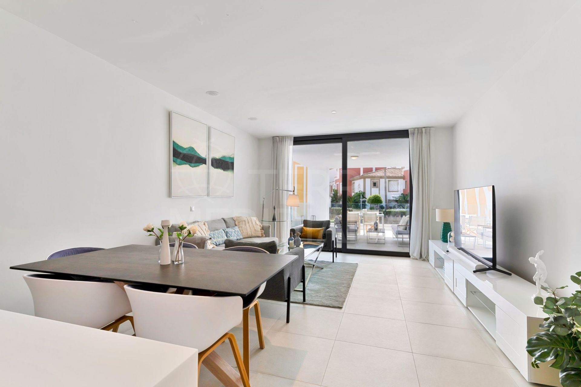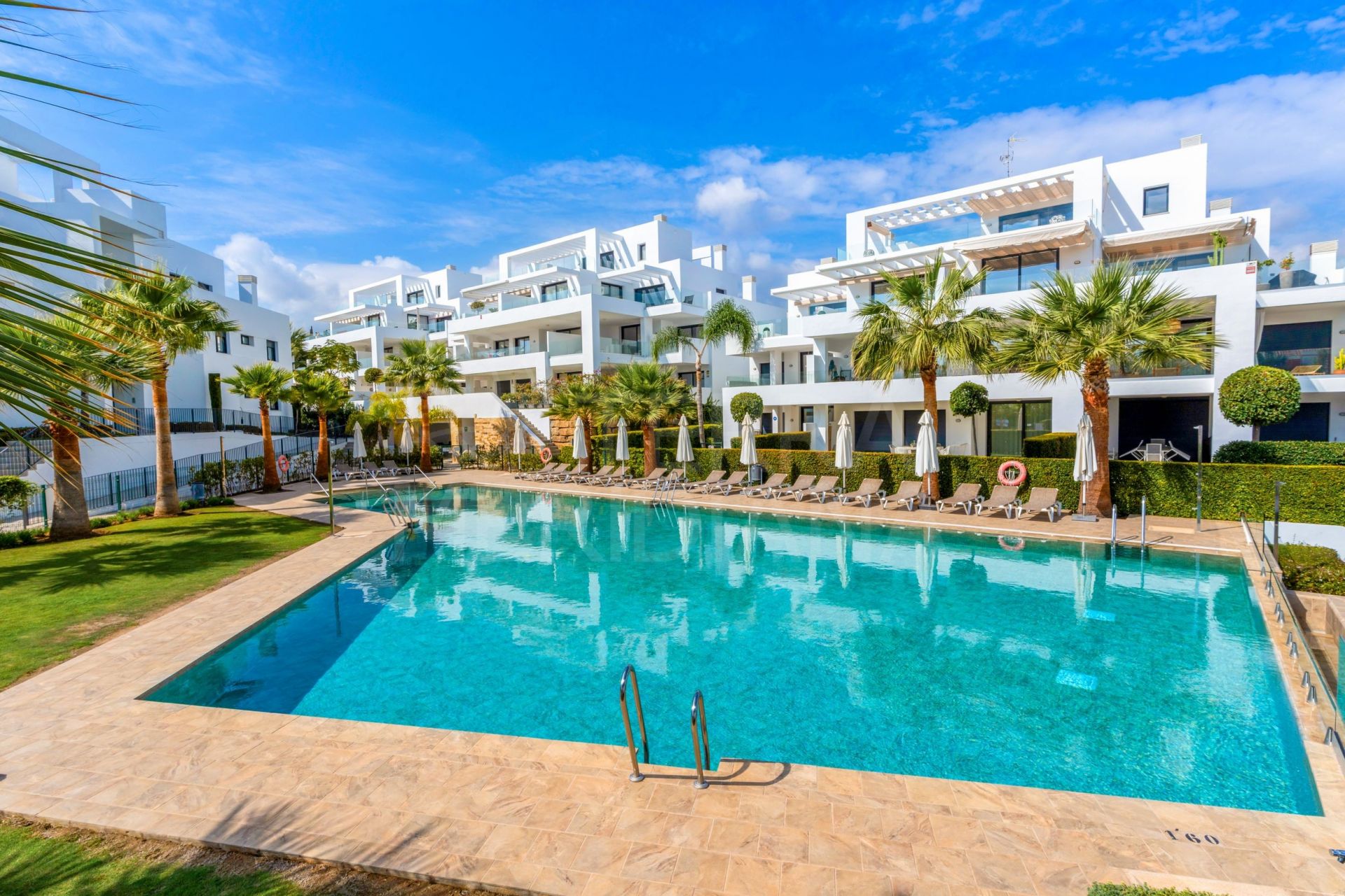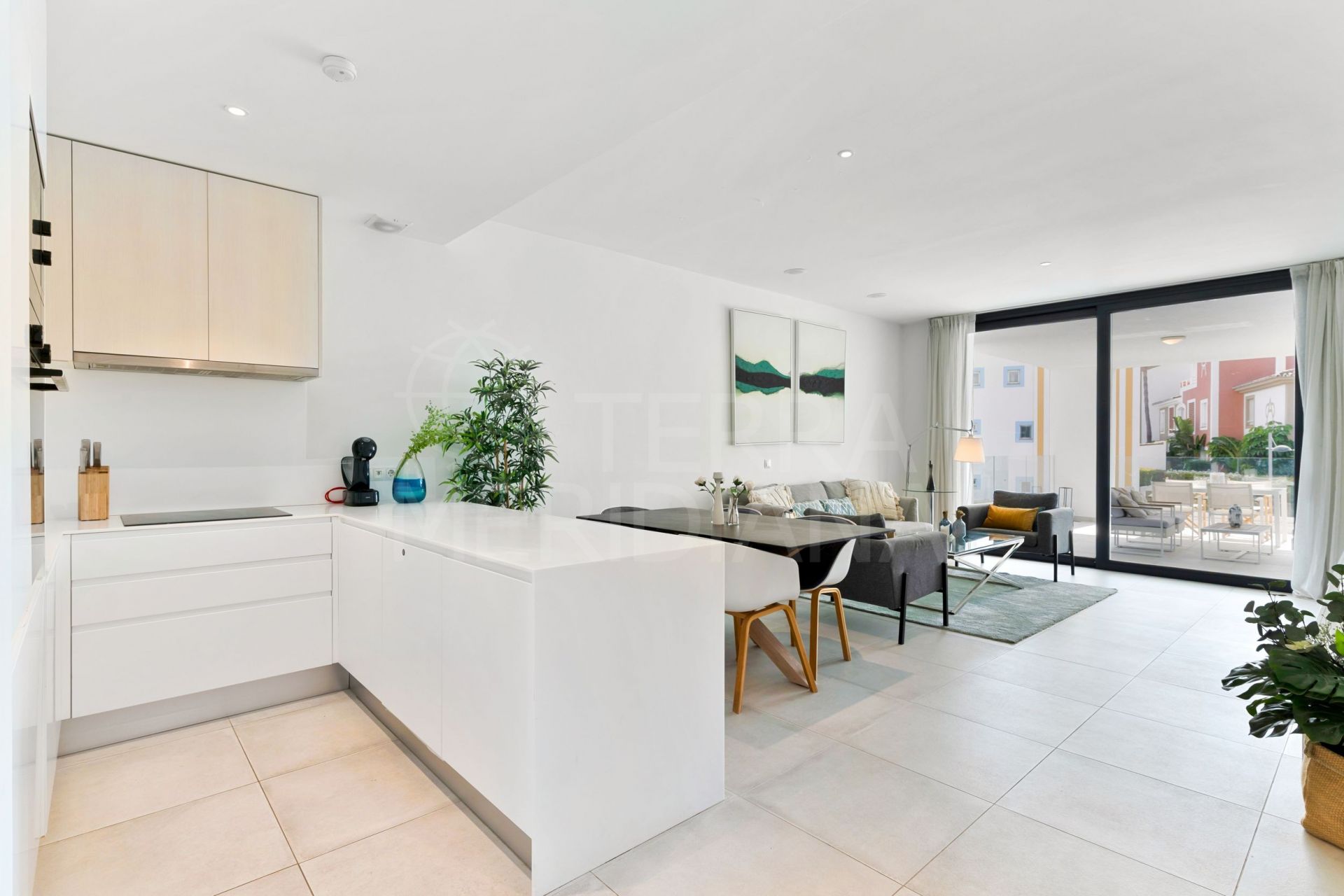 The property features an open-plan living and dining area, a private terrace, a dedicated garage space, and a secure storage room. Residents also enjoy access to a one-of-a-kind communal swimming pool, designed to provide a unique and relaxing environment.