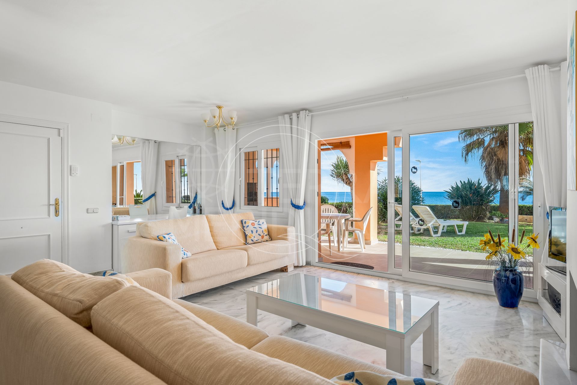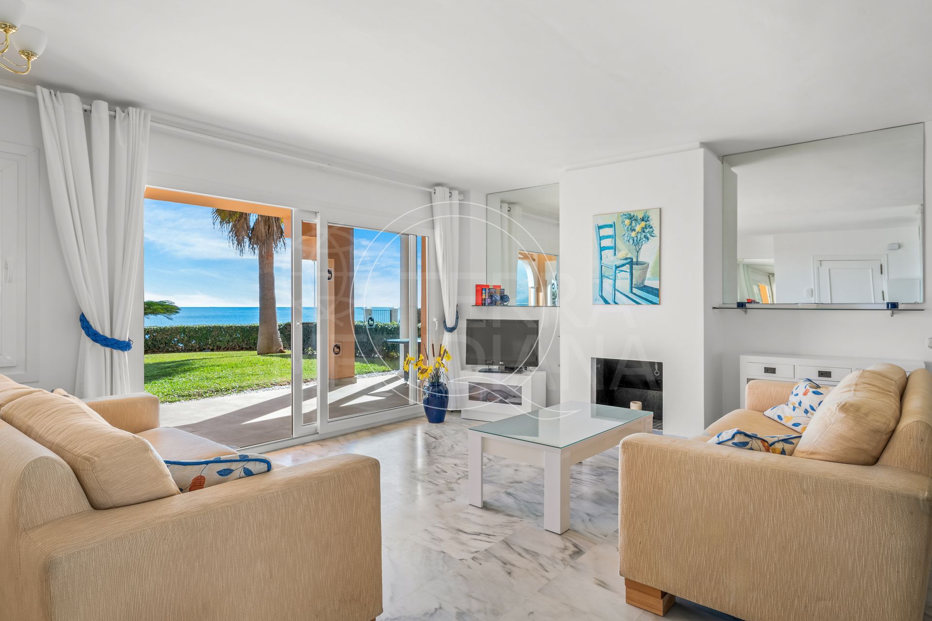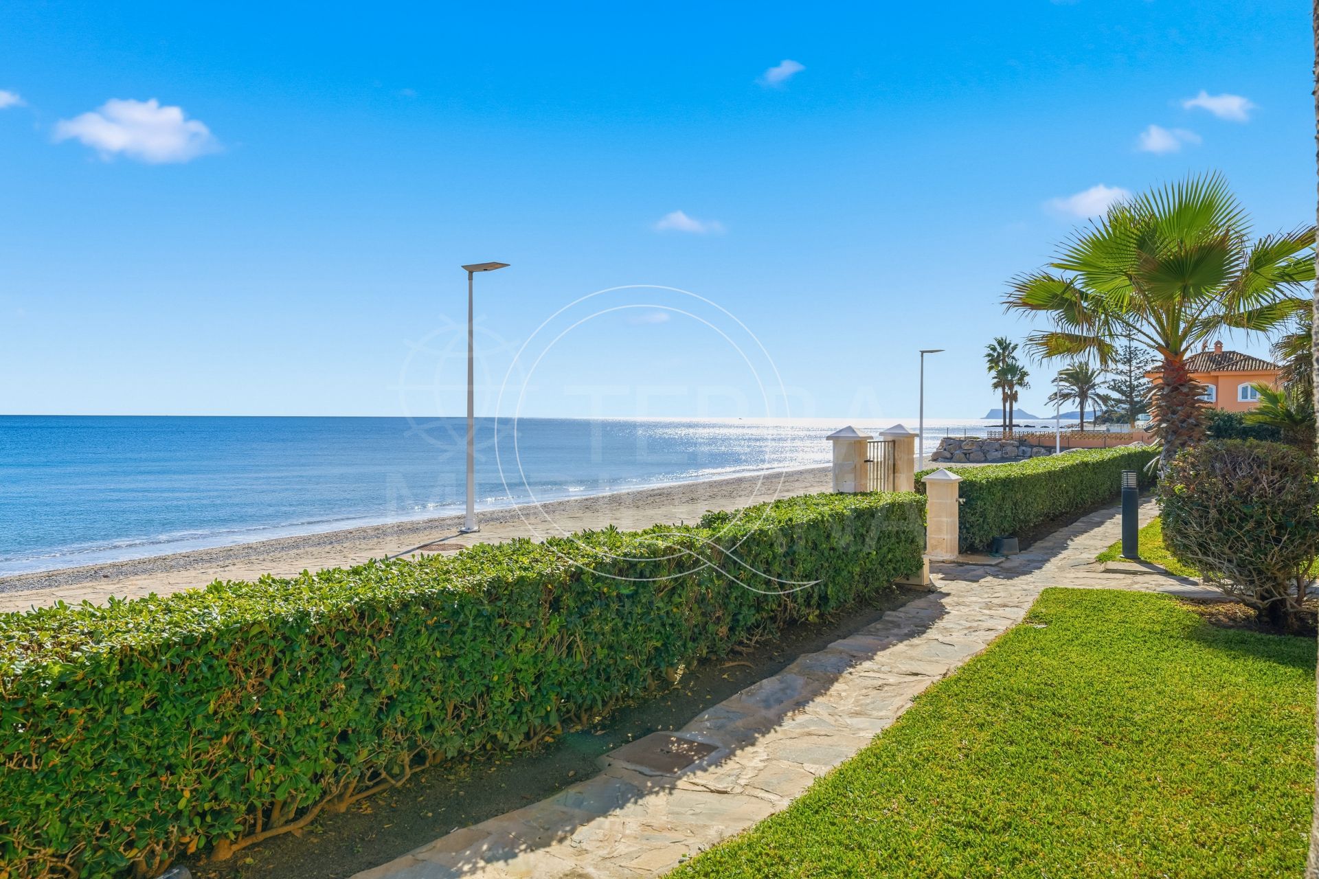Located in a prestigious front-line beach complex just west of Estepona, this three-bedroom ground-floor apartment offers an exceptional blend of coastal comfort and relaxed Mediterranean living. With direct access to the garden and just steps from the sand and the iconic Paseo Marítimo, it provides a rare opportunity to enjoy the beachfront lifestyle in one of the area’s most sought-after settings.